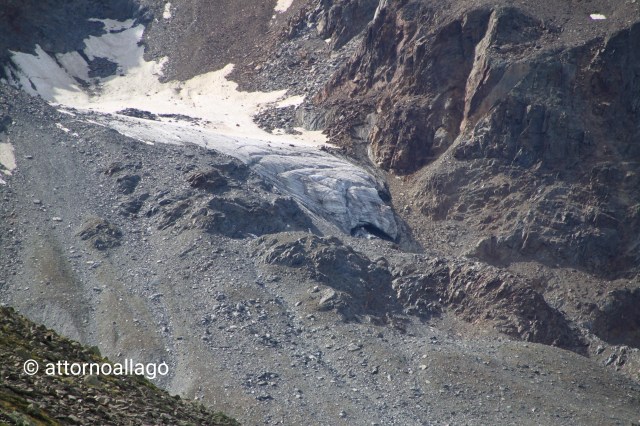 Nonostante tutti gli avvertimenti ben visibili, la macchina umana dello sfruttamento di tutte le risorse fino all’ultimo granello è sempre attiva e mentre una squadra di escavatori sta sradicando alberi per costruire una nuova pista da sci (serviva davvero?), un’altra squadra di escavatori si intravede sul crinale del ghiacciaio, a 3200 metri d’altezza. Lo scorso anno, quando eravamo saliti a scoprire che il ghiacciaio giaceva malato sotto una copertina, avevo intravisto un sentiero che si inoltrava su quella stessa cresta su cui oggi ci sono i mezzi da lavoro. Staranno spianando la cresta per farne un sentiero più comodo e sicuro? Così tutti gli “alpinisti ciabattoni” (*) potranno tornare alle loro dimore a raccontare quale grande impresa hanno compiuto.