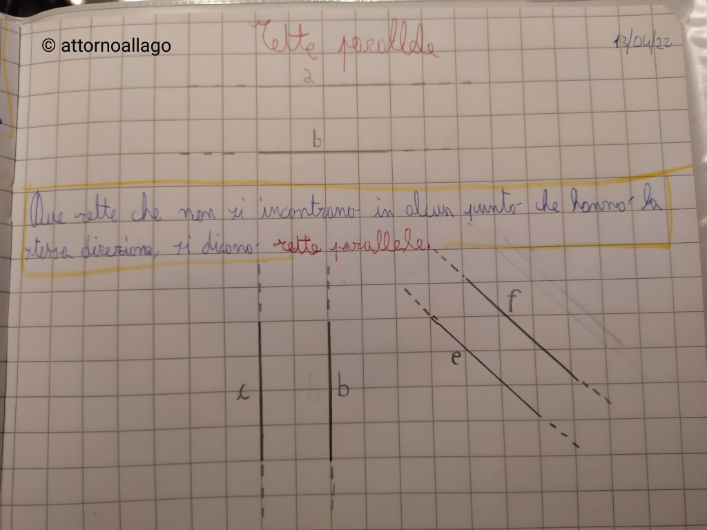 Per i lettori non italiani: il titolo della lezione doveva essere “Rette parallele”. Peccato che, al posto della r maiuscola, ci sia una t maiuscola…