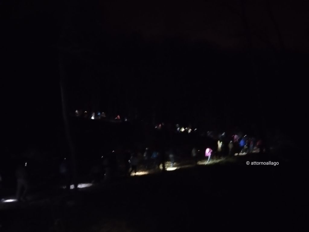 Anche noi chiacchieriamo con gli amici, i bambini frementi continuano ad accendere e spegnere le torce e le frontali e avrebbero l’istinto di correre via, cosa che gli vietiamo per evitare che si perdano nella notte.